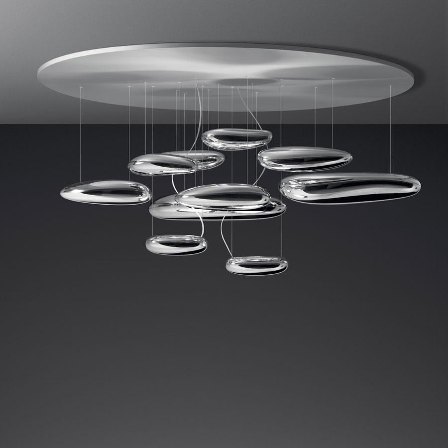 Mercury Led soffitto - Inox. DESIGN BY: Ross Lovegrove 2011. Una lampada che consiste in una serie di grandi ciotoli fluttuanti sotto un disco di alluminio semplice e moderno. A loro volta, i ciotoli si riflettono l’un l’altro, facendo rimbalzare la lucetra le loro lisce superfici biomorfiche. Durante il giorno l’oggetto è una scultura che riflette le dinamiche della luce naturale e il movimento delle persone attorno a sé. Corpi luminosi in alluminio pressofuso; corpi riflettenti in materiale termoplastico stampato ad iniezione con finitura metallizzata; riflettore in acciaio inox.