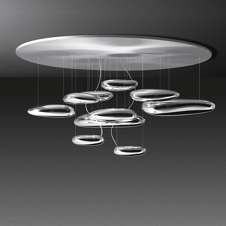 Mercury Soffitto LED 2700K - Cromo lucido - Una lampada che consiste in una serie di grandi ciotoli fluttuanti sotto un disco di alluminio semplice e moderno. A loro volta, i ciotoli si riflettono l’un l’altro, facendo rimbalzare la luce tra le loro lisce superfici biomorfiche. Durante il giorno l’oggetto è una scultura che riflette le dinamiche della luce naturale e il movimento delle persone attorno a sé. Corpi luminosi in alluminio pressofuso; corpi riflettenti in materiale termoplastico stampato ad iniezione con finitura metallizzata; riflettore in acciaio inox. Dimmable (SwitchDim). Emissione: Indiretta. Lampadina inclusa. Alimentazione elettronico dimmerabile Push. LED 23.62W 2656lm 2700K CRI 90.