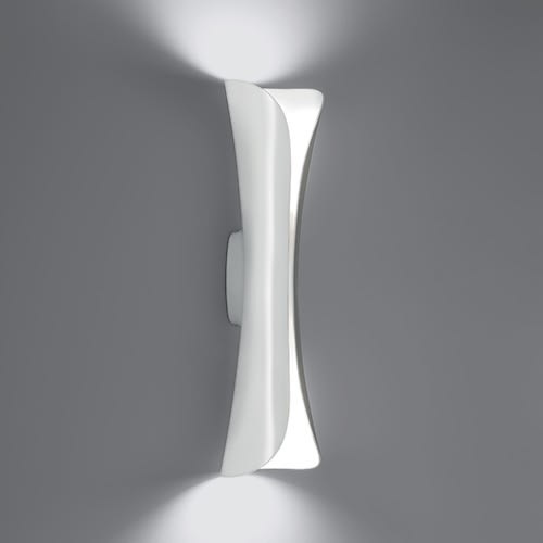 Lampada da parete. Un foglio d'acciaio avvolge e sprigiona nello stesso tempo una morbida luce, indiretta verso l'alto e diffusa lungo l'apertura verticale della lampada. Le due sorgenti luminose alogene per emissione indiretta ed emissione diffusa, sonogestibili separatamente. Corpo lampada in acciaio verniciato con copribase in acciaio inox verniciato.
