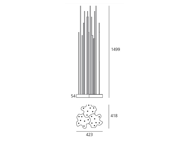Reeds IP67 Triplo. Apparecchio di illuminazione da terra a luce diffusa che impiega sorgenti a LED monocromatici. Disponibile con gradi di protezione IP20 per interno, IP67 e IP68 per esterno. Le versioni IP67 e IP68 sono disponibil in forma Singola o Tripla. La luce si diffonde attraverso 7 aste in PMMA aventi altezze diverse per dare l’impressione di un canneto e avvitabili alla base grazie a bussole in acciaio INOX AISI 316. Parte della luce si diffonde sul suolo anche attorno alla base stessa. La base, di forma irregolare, è studiata per consentire l’incastro «a mosaico» con altri apparecchi in modo da creare una composizione articolata a piacimento. Caratteristiche tecniche conformi alla EN60598-1 (IP20 e IP67) e parte 2-18 (IP68). Composto da unabase costituita da un involucro in policarbonato trasparente montato tra 2 piastre in acciaio INOX AISI316 serrate con viti in acciaio INOX AISI316 . La tenuta all’acqua è garantita da una guarnizione siliconica. L’apparecchio può essere fissato a terra grazie ai fori inseriti nella piastra inferiore. Coperchio estetico in tecnopolimero. Completo di alimentatore integrato e fornito con 1,5 m di cavo H05RN-F 2x1 provvisto di connettore IP67 per la connessione elettrica alla rete idoneo per cavi di diametro 5-13,5mm.
