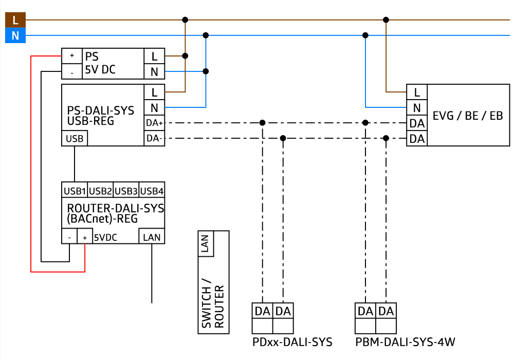 Router con WEB server integrato e controller dell'applicazione per il montaggio su guida DIN EN 60715, 4 porte USB per controllare fino a 4 separati Controller B.E.G. con alimentatore DALI integrato, 1 porta LAN per collegare in rete fino a 100 dispositivi, fino a 400 linee DALI interconnesse , Gestione centralizzata dei parametri, indirizzi, gruppi e scene per tutti i componenti DALI in rete, Logica applicativa decentralizzata in multisensori e pulsanti: il router assume solo funzioni di livello superiore, Gestione degli utenti e delle autorizzazioni per ruoli diversi, Gestore lampade di emergenza DALI, Funzione di luce guida estesa (su tutte le linee DALI), Funzione di routing degli eventi per realizzare scenari di illuminazione interlinea tra linee DALI diverse, Funzione Update Manager, per l'aggiornamento del firmware del router tramite LAN / WAN, Puo essere gestito tramite web browser compatibile e qualsiasi dispositivo (smartphone, tablet, PC), Strumenti di diagnosi e analisi del consumo di energiae per la ricerca di guasti, Monitoraggio della temperatura del processore principale e dell'involucro, Ventola di alta qualita con controllo automatico della velocita, Orologio in tempo reale integrato, Visualizzazione LED dello stato, Incluso alimentatore da 5 VDC / 2 A er montaggio su guida DIN (1TE) fornito in involucro separato, Inclusi 4 cavi di collegamento USB (0,5 m) e 1 cavo LAN (0,5 m), Supporto B.E.G. alla proggettazione gratuito, Supporto per la messa in servizio da parte di B.E.G. a pagamento, Assistenza e manutenzione da remoto tramite una connessione VPN esistente o una fornita da B.E.G., Piccoli lavori di manutenzione (ad esempio la sostituzione degli apparecchi di illuminazione) possono essere eseguiti in autonomia da un tecnico o da un installatore elettrico locale