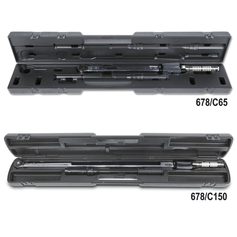 La chiave dinamometrica Beta 678/C e particolarmente adatta per gli utilizzi gravosi a elevate coppie di serraggio. Il meccanismo a scatto avvisa l'operatore del raggiungimento della coppia impostata attraverso uno scatto meccanico percettibile anche all'udito. Caratteristiche: ? Precisione ? 4% come da normativa UNI EN ISO 6789 ? Scala graduata con incremento di 10 Nm ? Cricchetto semplice per un utilizzo sia destrorso sia sinistrorso ? Scatto udibile per segnalare il raggiungimento della coppia impostata ? Chiave fornita con cassetta ? Corredata di certificato di taratura secondo la norma UNI EN ISO 6789