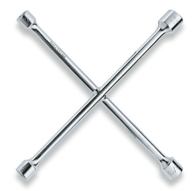 Chiave a croce in acciaio per allentare e svitare i dadi delle ruote in maniera rapida e sicura. La chiave si compone di 4 inserti per ruote da 17-19-21-23 mm per essere utilizzata sui modelli piu diffusi.