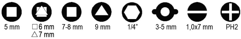 ? Quadro da 5 / 6 / 7-8 mm ? Triangolo da 7 / 9 mm ? Alette 3-5 mm ? Esagono 1/4; ? Inserto doppio con intaglio 1,0x7 mm e impronta a croce PH2 ? Chiave utilizzabile per la manutenzione in numerosi settori come quello elettrico, idraulico, ventilazione, gas e altro.