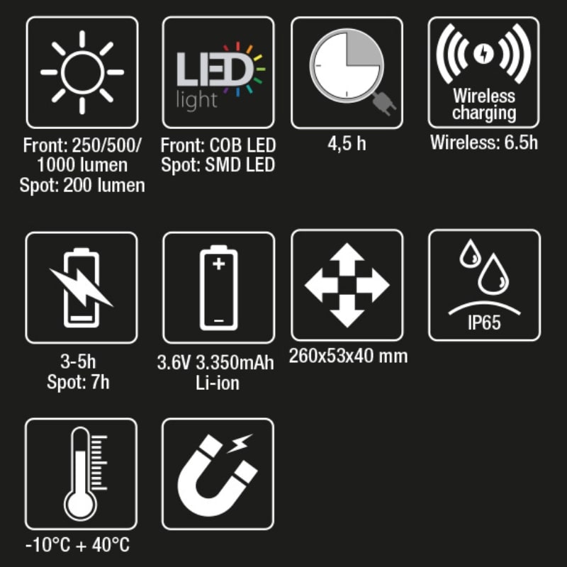 Caratteristiche: ? Doppia emissione luminosa: frontale: LED COB, 3 intensita luminose: 250 - 500 -1000 Lumen spot (testa): LED SMD, 200 lumen ? Batteria ricaricabile 3.6V 3.350mAh Li-ion ? 2 modalita di ricarica: base wireless 1839BRW alimentatore con attacco USB-C ? Tempo di ricarica: 6.5h con base ricarica wireless 4.5h con alimentatore ? Autonomia: frontale: 3-5h spot (testa): 7h ? Indicatore livello di batteria a 3 led ? Base orientabile a 180? ? Corpo in gomma antiscivolo ? Doppio gancio orientabile ? Magneti su base e retro ? IP65 ? IK07