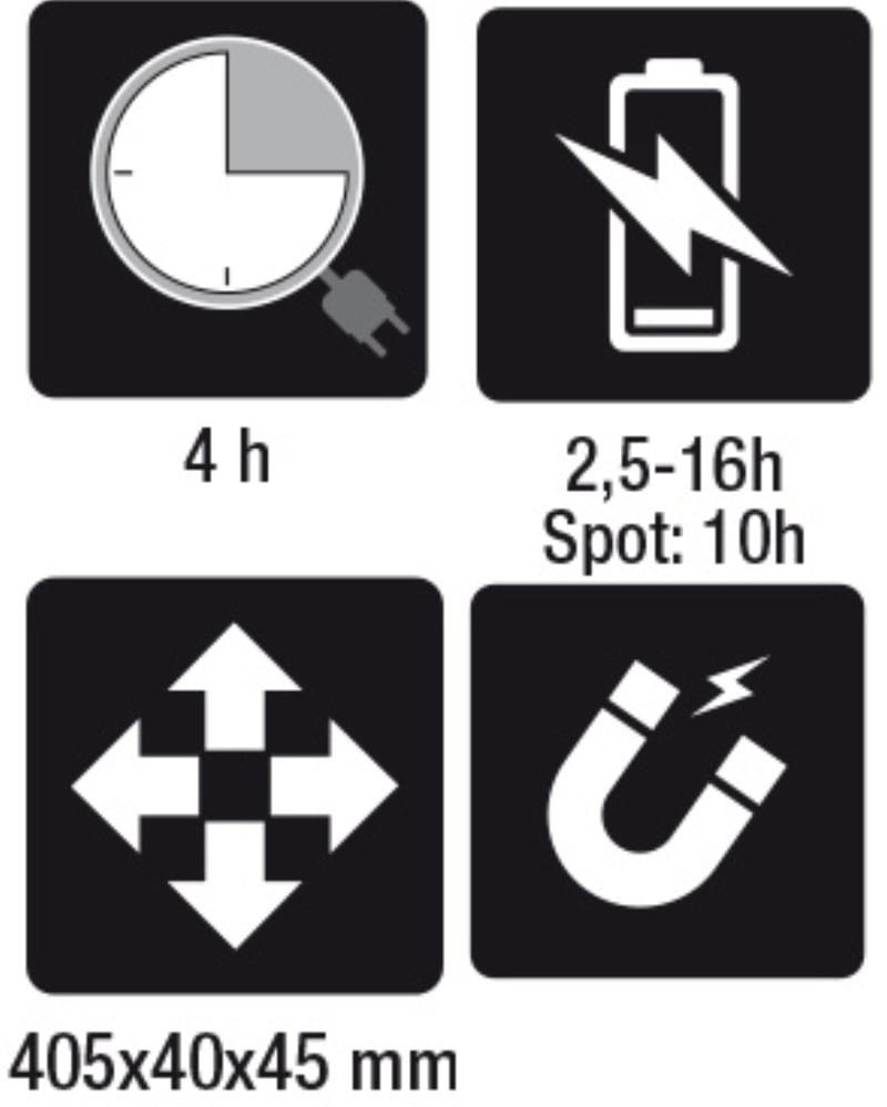 Caratteristiche: ? Doppia emissione luminosa: frontale: LED COB, 60-700 lumen, regolabile con potenziometro spot (testa): LED SMD, 120 lumen, interruttore ON-OFF ? Batteria ricaricabile 3.6V 2600mAh Li-ion ? Attacco USB-C ? Fornita con caricatore 100-240V / 50-60Hz ? Tempo di ricarica: 4h ? Autonomia: frontale: 2.5-16h spot (testa): 10h ? Indicatore livello di batteria a 3 led ? Snodata e orientabile a 180? (? 90? rispetto all'asse) ? Base magnetica (con magnete al neodimio) orientabile a 90? ? Gancio orientabile alla base ? IP54 ? IK07