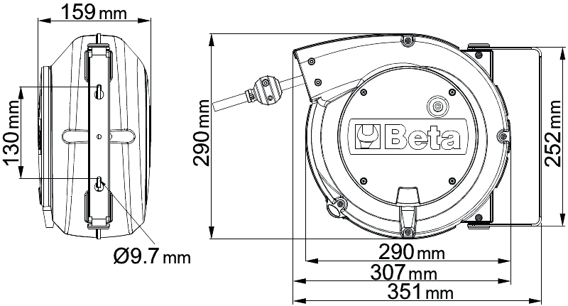 Caratteristiche: ? Cavo 4Gx1,5 mm? ? Senza protettore termico ? Lunghezza cavo fuori scocca 1 m ? Fornito senza cavo in entrata ? Cremagliera disinseribile per cavo sempre in trazione ? Potenza max. arrotolata 1400W (400V-20?C) ? Potenza max. srotolata 1900W (400V-20?C) ? Fornito con staffa orientabile di 180? e seconda staffa a incastro rapido