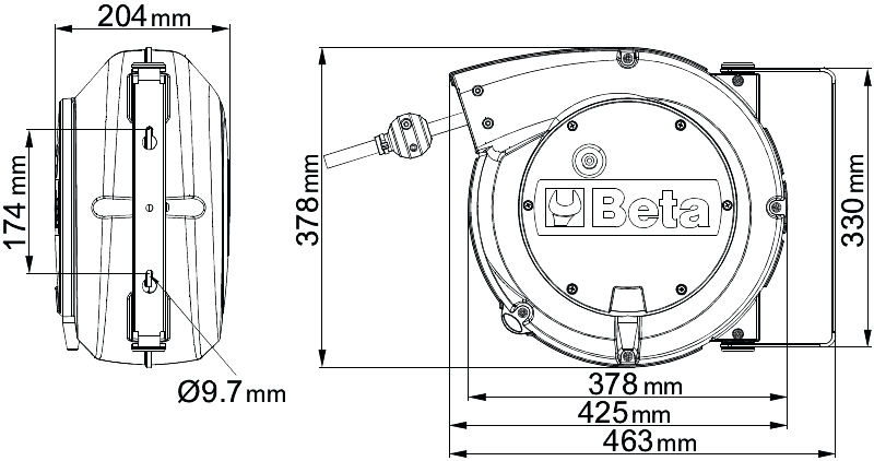 Caratteristiche: ? Cavo 4Gx2,5 mm? ? Senza protettore termico ? Lunghezza cavo fuori scocca 1 m ? Fornito senza cavo in entrata ? Cremagliera disinseribile per cavo sempre in trazione ? Potenza max. arrotolata 2000W (400V-20?C) ? Potenza max. srotolata 2700W (400V-20?C) ? Fornito con staffa orientabile di 180? e seconda staffa ad incastro rapido
