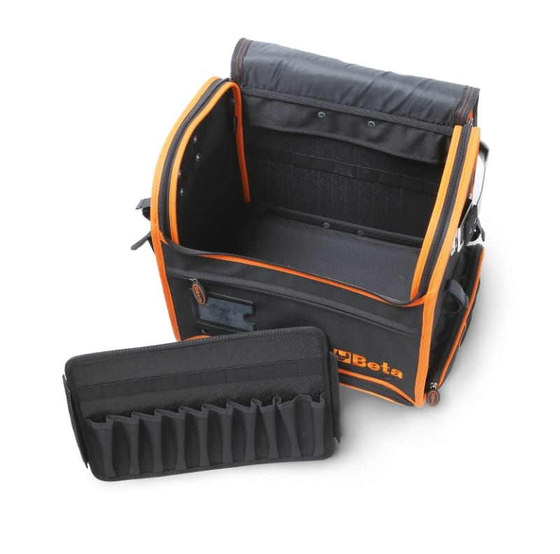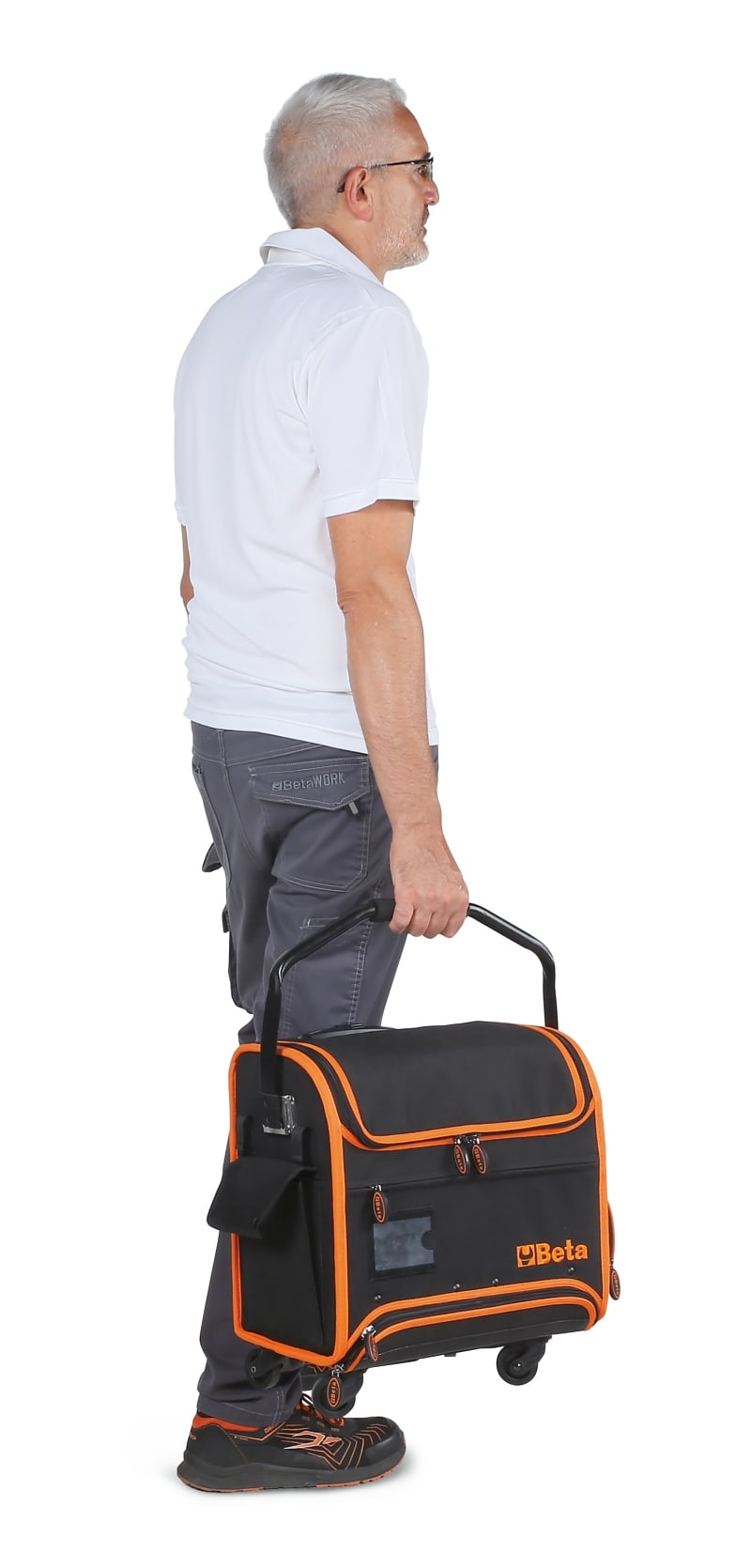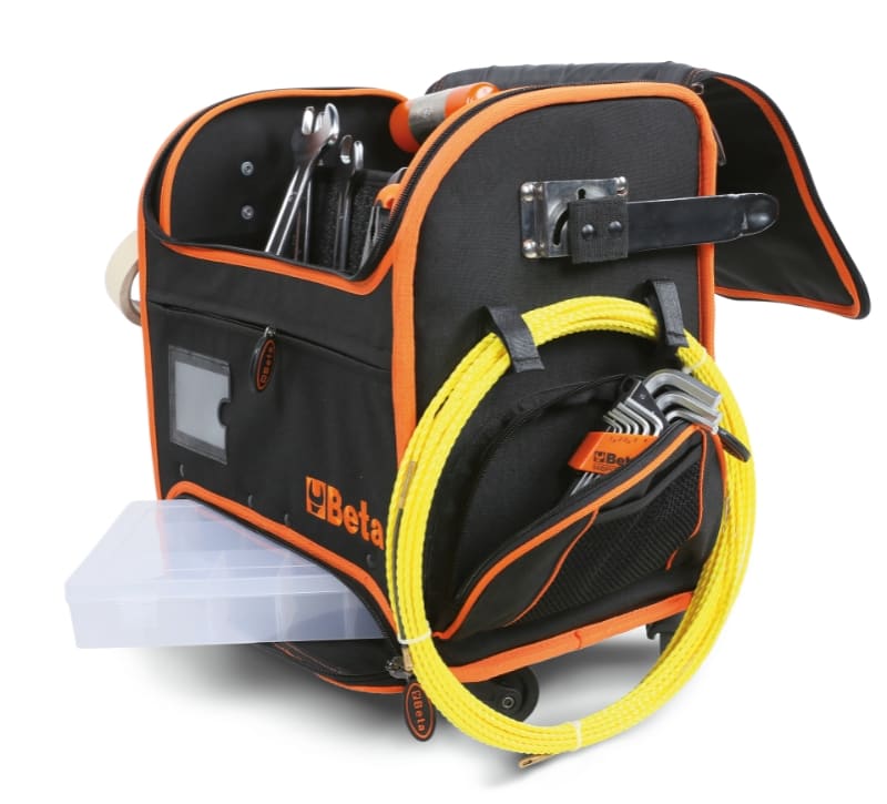 Ideale per elettricisti Caratteristiche: ? Struttura rigida ? Manico telescopico di trasporto ? 4 ruote piroettanti ? 1 pannello interno portautensili removibile ? Tasca frontale con porta badge ? Doppio fondo con portaminuteria compreso ? 2 tasche esterne laterali ? 2 ganci porta sonda tirafili ? Manico inclinabile per facilitare l'accesso agli utensili ? Possibilita di chiusura con lucchetto (non compreso) ? 380x250x430 mm - ? 4,7 kg