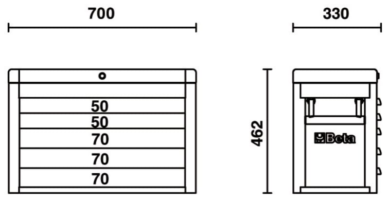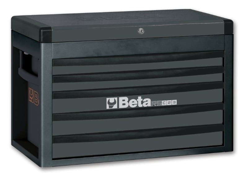Cassettiera portautensili Beta con 5 cassetti da 588x277 mm, montati su guide telescopiche a sfera: ? 2 cassetti altezza 50 mm ? 3 cassetti altezza 70 mm Caratteristiche: ? Serratura centralizzata frontale ? Maniglie laterali a scomparsa per trasportarla facilmente