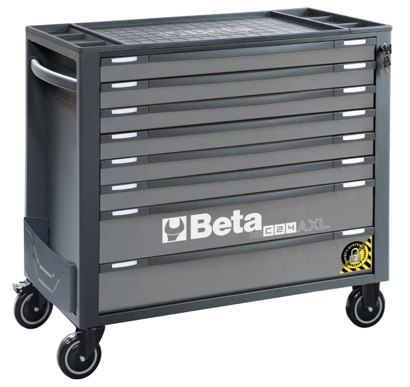 Modello lungo con 8 cassetti da 882x367 mm ad estrazione totale, montati su guide telescopiche a sfera: ? 6 cassetti altezza 70 mm ? 2 cassetto altezza 140 mm Caratteristiche: ? Nuovo piano di lavoro rinforzato in ABS con bordi anticaduta, otto fori per l'alloggiamento dei giravite e 6 vaschette portaminuterie ? Frontalino in nylon ad alta resistenza, con porta-etichette integrato ? Piano dei cassetti protetto da tappetini di gomma espansa ? Quattro ruote ? 125 mm di cui 2 fisse e 2 girevoli (una con freno) ? Serratura di sicurezza centralizzata frontale ? Capacita di carico statico pari a 1.000 kg ? Portaflaconi laterale integrato (applicabile su entrambi i lati) ? Possibilita di inserire in ogni cassetto fino a 6 vassoi morbidi in EVA o termoformati rigidi in ABS Accessori integrabili: ? Piano di lavoro in legno 2400 RSC24/PL ? Porta documenti 2400 RSC24//PD-A ? Portacarta per rotoli preforati 2400 RSC24/PC-A Sul piano di lavoro e collocabile a misura una cassettiera portatile RSC22, RSC23, RSC23C e RSC23T.