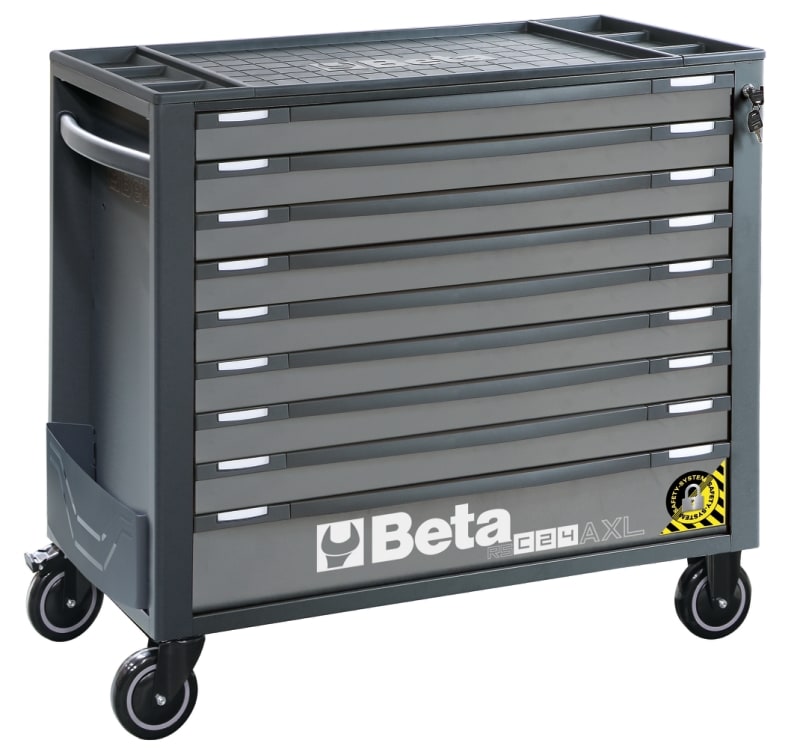 Modello lungo con 9 cassetti da 882x367 mm ad estrazione totale, montati su guide telescopiche a sfera: ? 8 cassetti altezza 70 mm ? 1 cassetto altezza 140 mm Caratteristiche: ? Nuovo piano di lavoro rinforzato in ABS con bordi anticaduta, otto fori per l'alloggiamento dei giravite e 6 vaschette portaminuterie ? Frontalino in nylon ad alta resistenza, con porta-etichette integrato ? Piano dei cassetti protetto da tappetini di gomma espansa ? Quattro ruote ? 125 mm di cui 2 fisse e 2 girevoli (una con freno) ? Serratura di sicurezza centralizzata frontale ? Capacita di carico statico pari a 1.000 kg ? Portaflaconi laterale integrato (applicabile su entrambi i lati) ? Possibilita di inserire in ogni cassetto fino a 6 vassoi morbidi in EVA o termoformati rigidi in ABS Accessori integrabili: ? Piano di lavoro in legno 2400 RSC24/PL ? Porta documenti 2400 RSC24//PD-A ? Portacarta per rotoli preforati 2400 RSC24/PC-A Sul piano di lavoro e collocabile a misura una cassettiera portatile RSC22, RSC23, RSC23C e RSC23T.