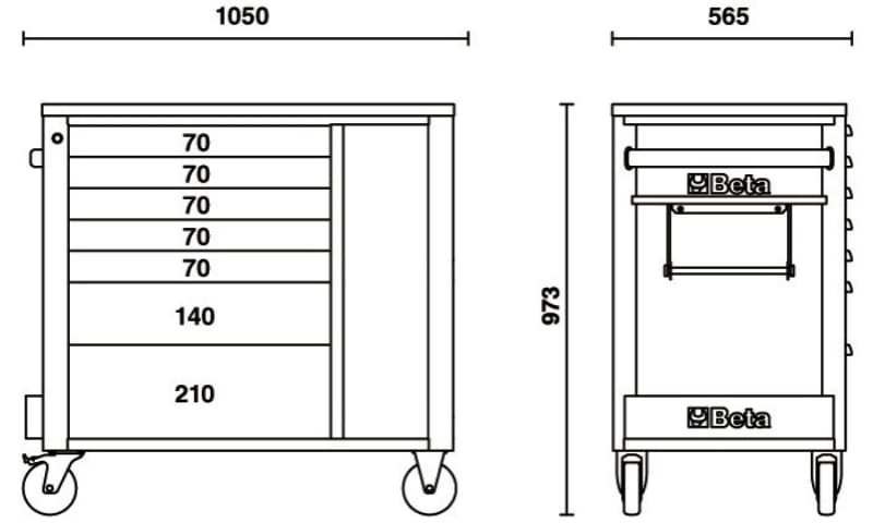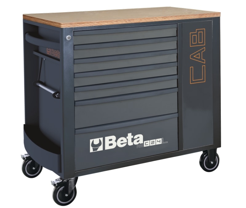 Cassettiera portautensili Beta con 7 cassetti da 588x367 mm, montati su guide telescopiche a sfera: ? 5 cassetti altezza 70 mm ? 1 cassetto altezza 140 mm ? 1 cassetto altezza 210 mm Caratteristiche: ? Piano dei cassetti protetto da tappetini di gomma espansa ? Quattro ruote ? 125 mm di cui 2 fisse e 2 girevoli con freno ? Serratura centralizzata frontale ? Armadietto laterale portaoggetti con anta richiudibile con serratura e ripiano interno regolabile in altezza ? Capacita di carico statico pari a 1.100 kg ? Piano di lavoro in legno multistrato con fori per la collocazione di una morsa (1599F/100 da ordinare separatamente) ? Portacarta integrato ? Doppio portaflaconi posteriore ? Portaflaconi laterale integrato