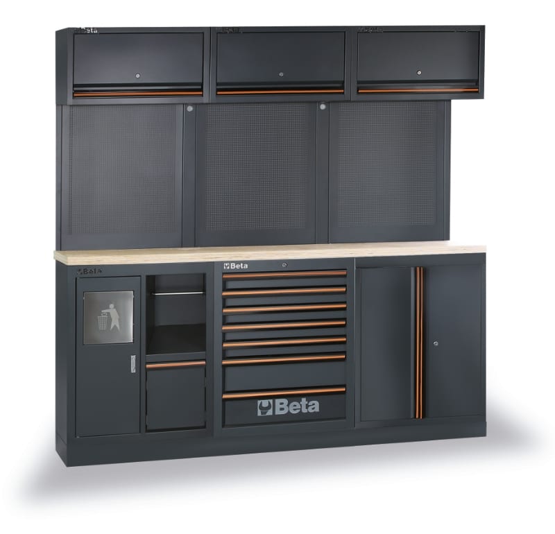 Combinazione composta da: ? Piano di lavoro in legno multistrato (C45PW/3-2,0MT) ? Modulo fisso con 2 antine (C45PRO MA) ? Modulo fisso con 7 cassetti (C45PRO M7) ? Modulo fisso di servizio (C45PRO MS) ? 3 pensili a muro (C45PRO PM) ? 3 pannelli forati portautensili (C45PRO PF) ? 2 staffa per parete tipo stretto (C45PRO SS) ? 2 staffe per parete tipo largo (C45PRO SL)