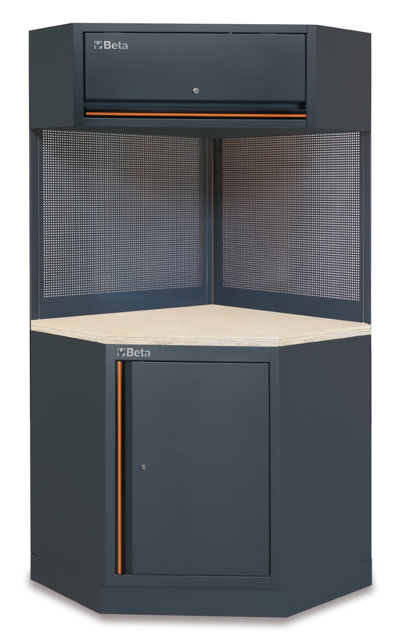 Caratteristiche: ? Pensile ad angolo con serratura dotato di molle a gas per facilitare l'apertura e la chiusura dell'anta ? 2 pannelli forati 1052x860 mm per il sostegno degli utensili ? Piano di lavoro angolare in MDF rivestito in acciaio inossidabile da 860 x 860 mm ? Modulo inferiore angolare con ampio vano porta-oggetti ? Dotato di piedini regolabili in altezza