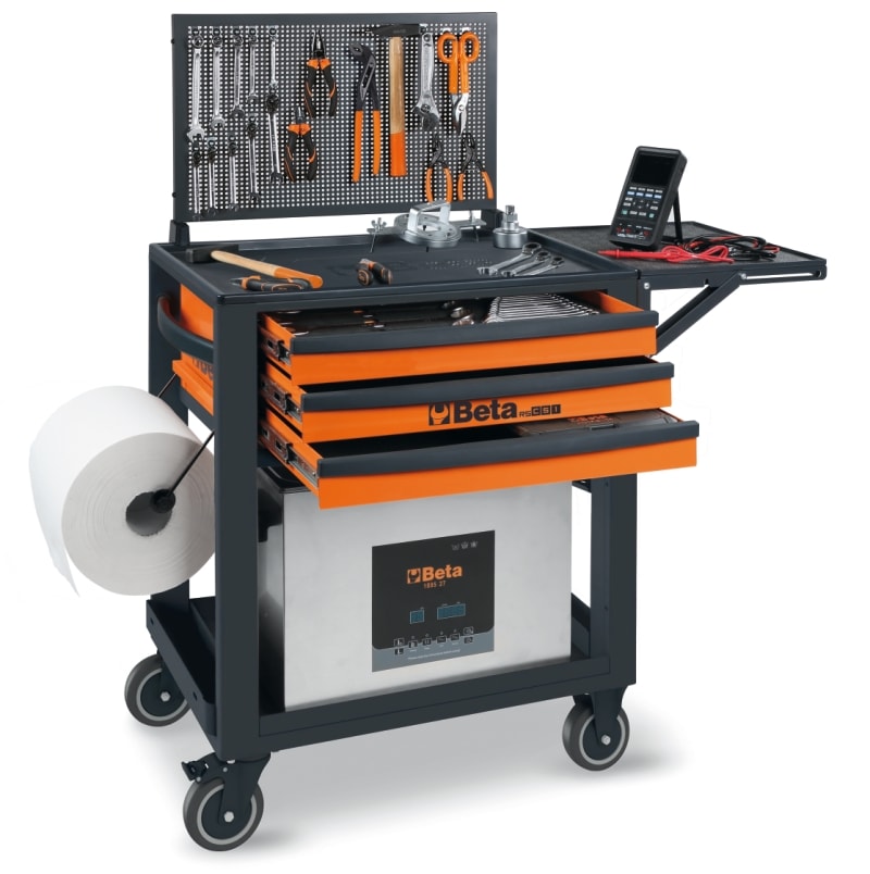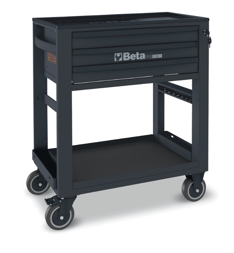 Completamente rinnovato ed accessoriabile, il carrello da lavoro Beta RSC51 e indispensabile per lavorare con la massima praticita. Caratteristiche principali: ? Piano di lavoro rinforzato in ABS, solido e robusto ? Piano di appoggio multifunzione con bordi anticaduta e 8 fori per l'alloggiamento dei giravite ? 3 cassetti da 588x367 mm, montati su guide telescopiche a sfera, altezza 70 mm ? Piano dei cassetti protetto da tappetini di gomma espansa ? Possibilita di inserire in ogni cassetto fino a 4 vassoi morbidi in EVA o termoformati rigidi in ABS ? Serratura di sicurezza centralizzata frontale ? Pratico portagiravite laterale incluso ? Due portabombolette laterali integrati nella struttura ? Ampio ripiano inferiore protetto con tappetino in gomma antiolio e antibenzina ? Quattro ruote ? 125 mm: 2 fisse e 2 girevoli (una con freno) ? Capacita di carico statico: 400 kg ? Portata singolo cassetto: 15 kg uniformemente distribuiti Accessori integrabili: ? Piano di lavoro in legno 2400 RSC24/PL ? Pannello forato portautensili 2400 RSC24/PF ? Supporto porta computer 2400 RSC24/SPC ? Mensola pieghevole 2400 RSC24/MP ? Portacarta per rotoli preforati 2400 RSC24/PC-A