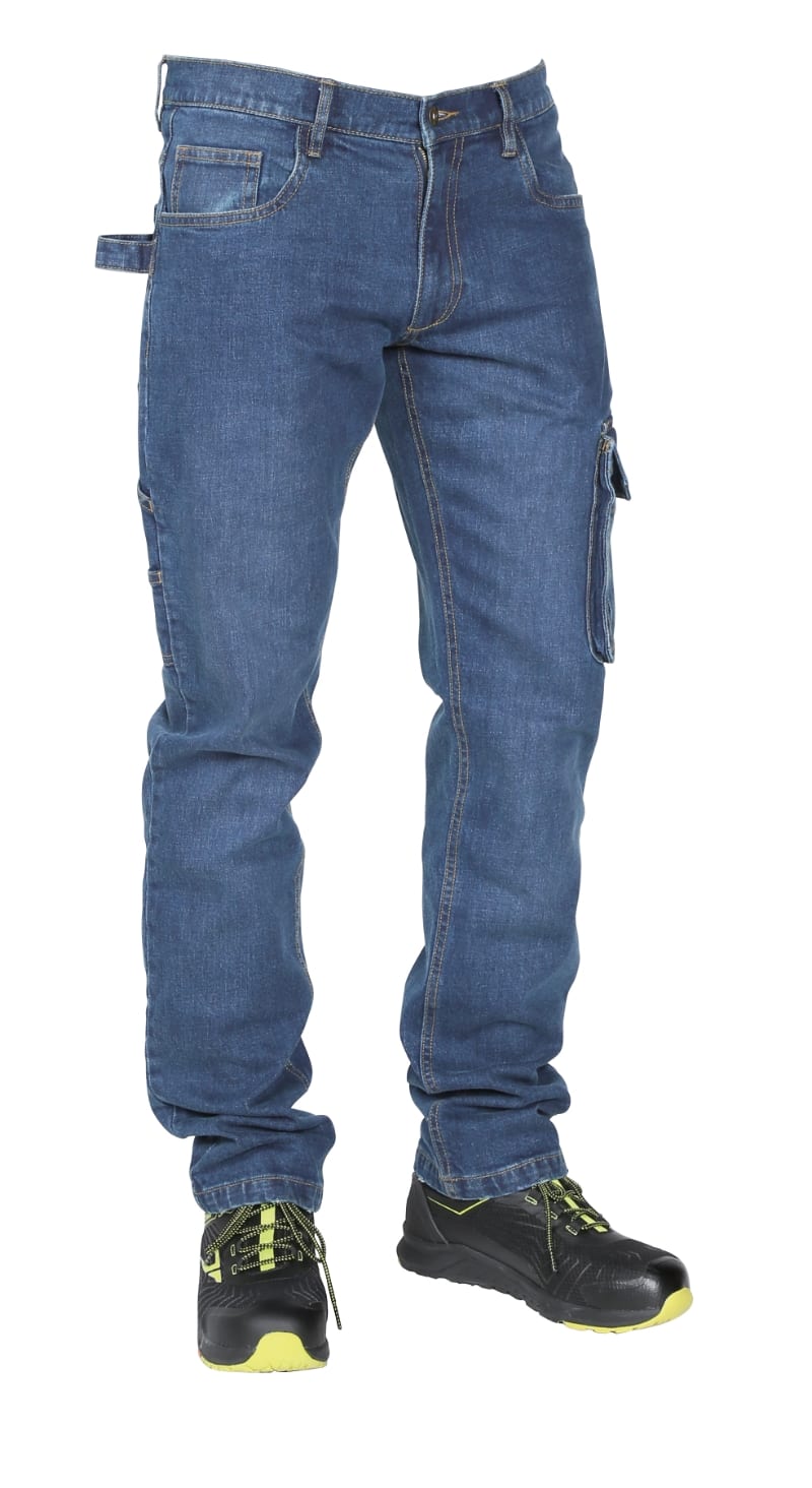 Composizione:98% Cotone denim, 2% tessuto elasticizzato, 10OZ Design:? Prelavaggio ?stone washed? ? Due ampie tasche anteriori ? Due tasche posteriori ? Tascone laterale sinistro con chiusura a strappo e taschino porta minuteria ? Tasca porta metro e fascia porta martello Colore:Blu Taglie:XS, S, M, L, XL, XXL, XXXL 46, 48, 50, 52, 54, 56, 58