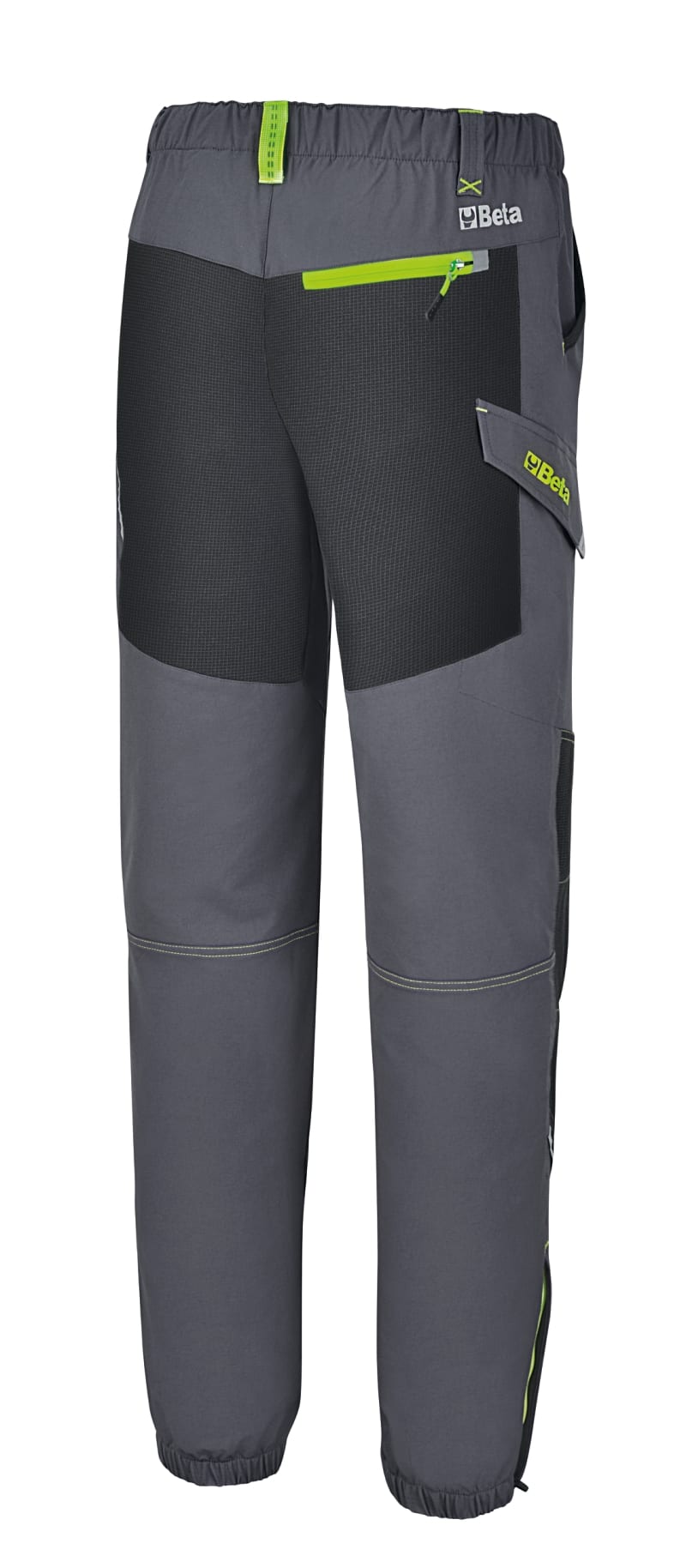 MATERIALI:90% nylon, 10% tessuto elasticizzato, 265 g CARATTERISTICHE:? Slim Fit ? Tessuto a 4 direzioni (4WAY STRETCH) per aumentare il comfort ? Inserti rinforzati su ginocchia e retro per aumentare la resistenza ? Vita elasticizzata ? Due tasche in vita ed una tasca posteriore con chiusura zip ? Una tasca laterale con chiusura a strappo ? Fondo gamba elasticizzato con chiusura zip verticale ? Inserti reflex COLORE:Grigio scuro con dettagli verde fluo Taglie:XS, S, M, L, XL, XXL, XXXL 46, 48, 50, 52, 54, 56, 58 MASSIMO COMFORT ? Il tessuto elasticizzato e in grado di seguire ogni movimento per garantire la massima comodita. ? Le cuciture preformate sul ginocchio aumentano il comfort. RESISTENZA E DURATA L'aggiunta di inserti in tessuto elasticizzato, altamente resistente all'abrasione, rende i pantaloni ancora piu duraturi. DESIGN E PRATICITA Il design innovativo e ispirato all'abbigliamento da montagna e l'elemento distintivo dei pantaloni ;work trekking; che combinano comodita con linee semplici e accattivanti.