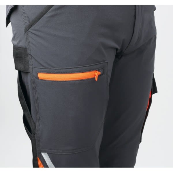 Pantaloni da lavoro multitasche elasticizzati. Composizione: • Tessuto elasticizzato 90% nylon, 10% spandex, 260 g • Tasche per ginocchiere, tasche posteriori e fondo gamba rinforzati in poliestere 600D. Design: • Vestibilità asciutta • Cavallo antistrappo • Vita più alta nella parte posteriore per maggiore protezione della schiena • Due ampie tasche anteriori, di cui una dotata di taschino con chiusura zip orizzontale • Due tasche posteriori con chiusura a strappo • Su gamba sinistra ampio tascone laterale con chiusura a strappo dotato di taschino verticale con chiusura zip • Tasca frontale su gamba destra con chiusura zip orizzontale • Ampie tasche per ginocchiere con chiusura a strappo • Tasca porta metro e nastro porta martello. Colore: Antracite