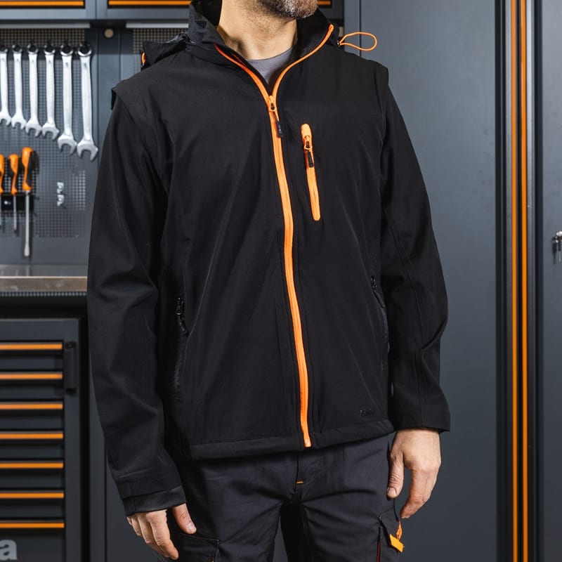 Composizione:? Tessuto: 86% nylon, 14% spandex, 140 g ? resistente all'acqua, antivento, traspirante e a rapida asciugatura Design:? Cappuccio a scomparsa, foderato, con regolatori a coulisse ? Maniche staccabili ? Chiusura frontale con zip ? Una tasca al petto con chiusura zip ? Due tasche in vita con chiusura zip ? Una tasca interna ? Vita regolabile con coulisse ? Polsini elasticizzati Colore:nero Taglie:XS, S, M, L , XL, XXL, XXXL