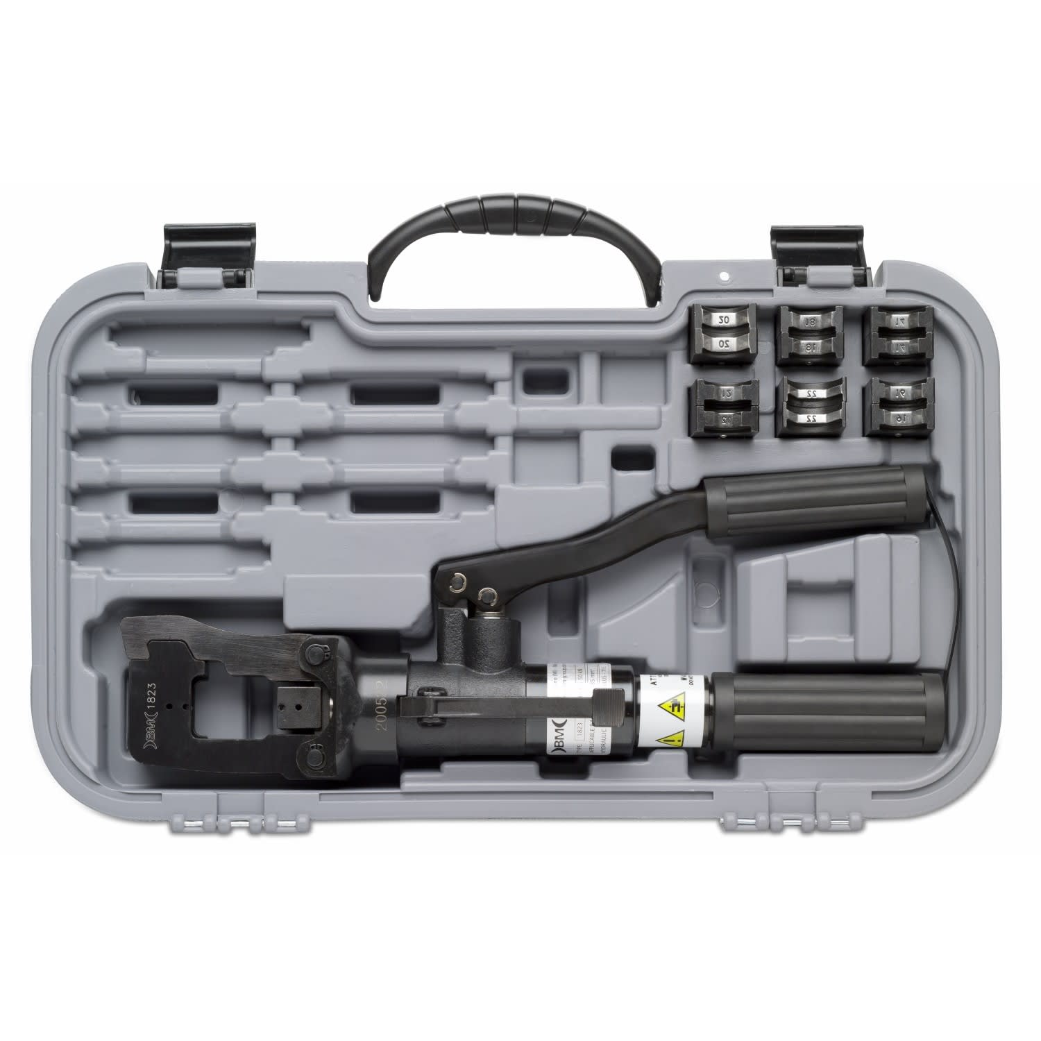 Pinza aggraffatrice oleodinamica manuale, 50kN, matrici serie 82 • apertura laterale a scatto per la crimpatura dei giunti e un veloce posizionamento delle matrici • testa ruotabile di 180° per facilitare l’aggraffatura in spazi limitati • due velocità di avanzamento del pistone: una di accostamento rapido delle matrici al terminale, l'altra di aggraffatura • dispositivo di sblocco automatico di fine crimpatura per garantire la qualità dell’aggraffatura • dispositivo di rilascio a levetta per riaprire lapinza a fine operazione o in caso di errata manovra