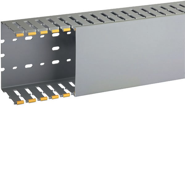 Canalette in PVC autoestinguente per il cablaggio di quadri elettrici, progettate per un'installazione sicura e ordinata. Dotate di coestruso morbido giallo sulle lamelle, misurano b120 x h80 mm con modulo 20 mm (feritoria 8 mm, lamella 12 mm). Conformi alla norma UL94 V0 e resistenti al filo incandescente fino a 960 °C (GWT EN 60695-2-11). Colore grigio RAL 7030, lunghezza 2 m, complete di coperchio.