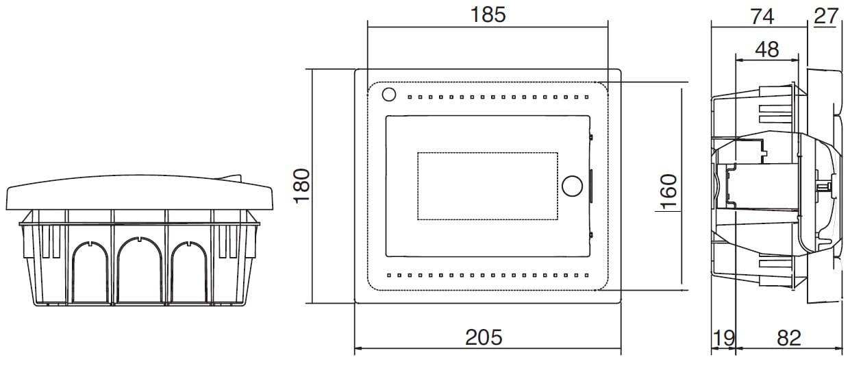 Il centralino di distribuzione da incasso, 6 moduli, con dimensioni di 205x180x27 mm (LxHxP) è ideale per installazioni con tubi corrugati. Realizzato in bianco RAL 9016, dotato di portella semitrasparente fumé e completo di scatola per muratura standardprofonda 74 mm, garantisce protezione IP40 e resistenza agli impatti IK08. Offre una dissipazione di 21 W.