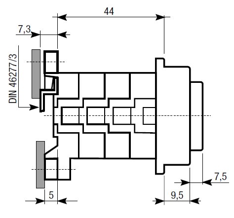 Commutatore di linea esecuzione DDN. Soluzione proposta da BREMAS per il montaggio del commutatore in quadri con feritoie normalizzate 46mm, con una profondità fissa di 44mm. Il fissaggio è a scatto su guida DIN, in alternativa è possibile fissare il commutatore al fondo del quadro mediante viti con interasse fori di fissaggio 48mm. La finitura prevede una mostrina grigia con manopola nera IP40.