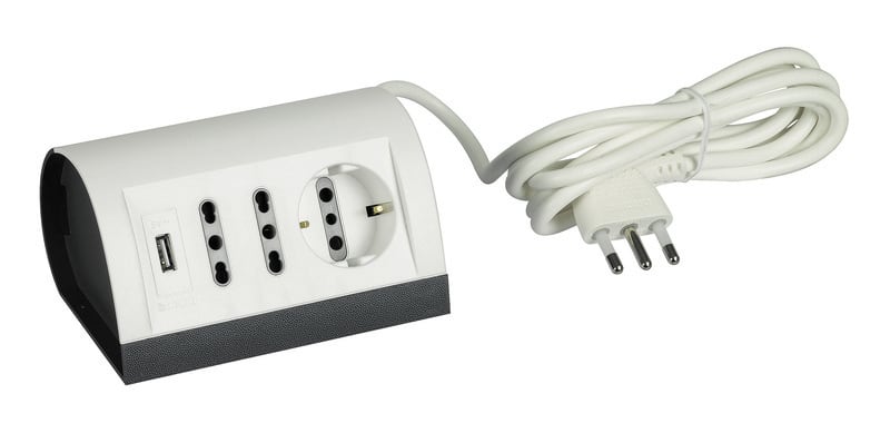 Multipresa da scrivania precablata con 2 prese bipasso 10/16A, una presa tedesca P30 e due prese USB alimentate 5V - 1,5A max, con 2 m di cavo, 250 Va.c. bianca