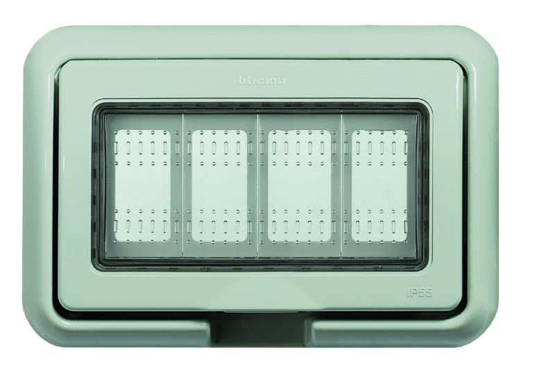coperchio IP55 per installazione incassata in scatola 504E di 4 moduli Màtix - colore bianco. Nota: il grado di protezione IP55 si ottiene a coperchio chiuso e con articolo installato su pareti lisce, senza scanalature ed impermeabili (piastrelle lisce, marmo)