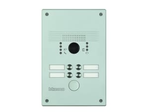 Pulsantiera Linea 300 video. Tecnologia 2 fili, antivandalica monoblocco fino a 4 chiamate in finitura alluminio. Comprensiva di : scatola da incasso, telaio, modulo fonico audio video a colori e modulo/i pulsanti precablati. Predisposizione per il montaggio frontale di un interruttore a chiave. Tasti di chiamata retroilluminati. Indicazioni visive e sonore per : chiamata in corso, sistema occupato, stato serratura. Viti antieffrazione. Permette l’attivazione di una elettroserratura collegata direttamente tra i morsetti S+ e S- (18 V 4 A impulsivi, 250 mA di mantenimento, 30 Ohm max).
