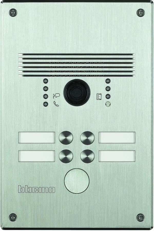 Pulsantiera Linea 300 video. Tecnologia 2 fili, antivandalica monoblocco fino a 12 chiamate in finitura acciaio Inox. Comprensiva di : scatola da incasso, telaio, modulo fonico audio video a colori e modulo/i pulsanti precablati. Predisposizione per il montaggio frontale di un interruttore a chiave. Tasti di chiamata retroilluminati. Indicazioni visive e sonore per: chiamata in corso, sistema occupato, stato serratura. Viti antieffrazione. Permette l’attivazione di una elettroserratura collegata direttamente tra i morsetti S+ e S- (18 V 4 A impulsivi, 250 mA di mantenimento, 30 Ohm max).