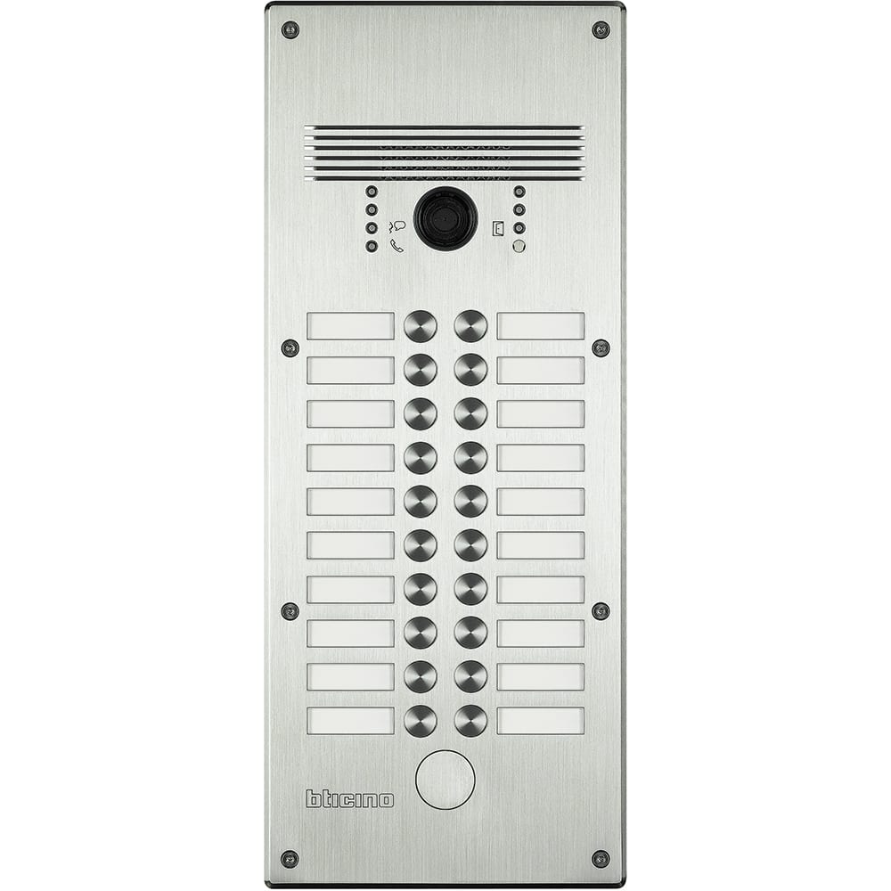 Pulsantiera Linea 300 video. Tecnologia 2 fili, antivandalica monoblocco fino a 20 chiamate in finitura acciaio Inox. Comprensiva di : scatola da incasso, telaio, modulo fonico audio video a colori e modulo/i pulsanti precablati. Predisposizione per il montaggio frontale di un interruttore a chiave. Tasti di chiamata retroilluminati. Indicazioni visive e sonore per: chiamata in corso, sistema occupato, stato serratura. Viti antieffrazione. Permette l’attivazione di una elettroserratura collegata direttamente tra i morsetti S+ e S- (18 V 4 A impulsivi, 250 mA di mantenimento, 30 Ohm max).