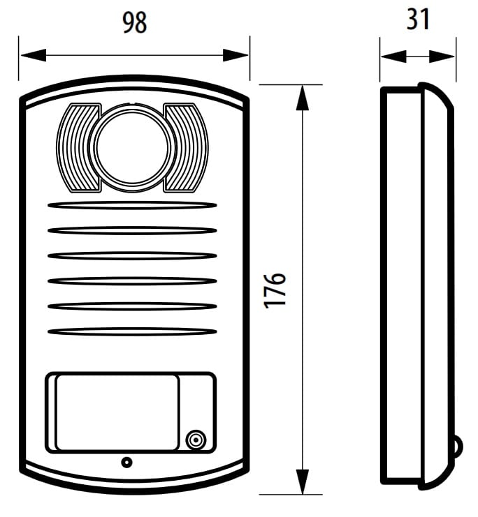 Pulsantiera Linea 2000 audio. Tecnologia 2 fili con un tasto di chiamata per installazione da parete. Frontale in alluminio. Illuminazione del cartellino portanome con LED verdi. Grado di protezione IP54. Grado di robustezza IK07. Permette l’attivazione di una elettroserratura collegata direttamente tra i morsetti S+ e S- (18 V 4 A impulsivi, 250 mA di mantenimento, 30 Ohm max).