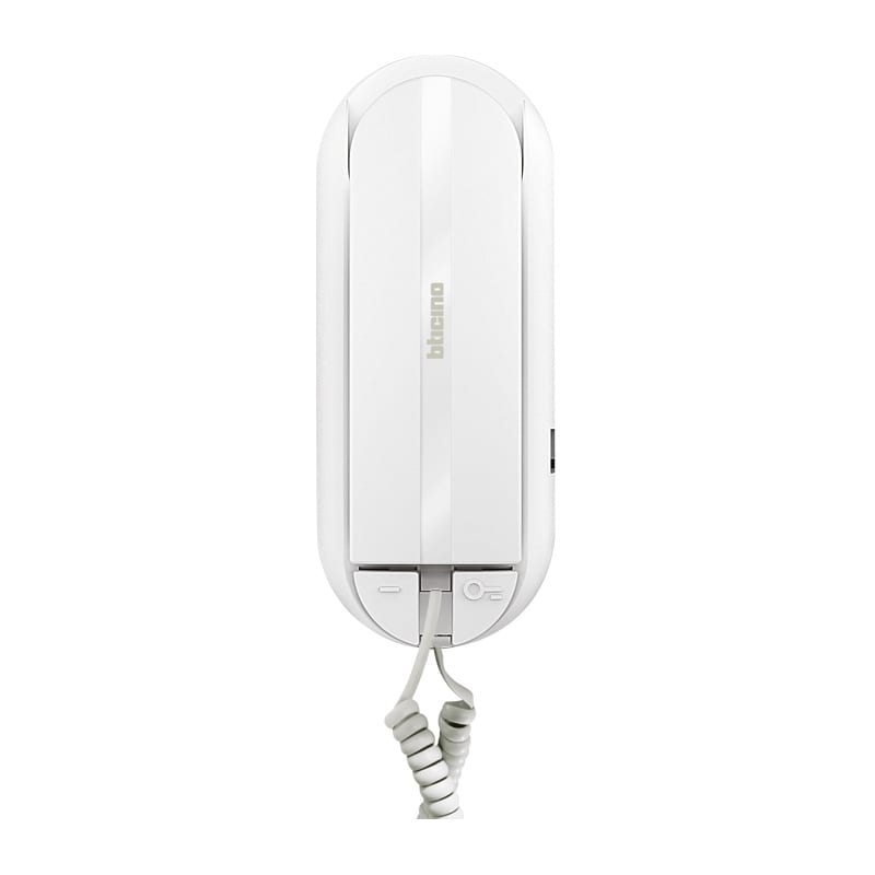 Citofono Sprint L2. Tecnologia 2 fili NON accessoriabile installabile da parete. E’ dotato di pulsante attivazione elettroserratura e di pulsante configurabile per funzioni ausiliarie (accensione luci scale, attivazione posto esterno, chiamata al centralino di portineria). Dispone di morsetti per il collegamento di un pulsante esterno di chiamata al piano. Se installato in impianti video o misti audio/video come ultimo apparecchio di montante o di tratta d’appartamento, deve essere corredato di terminazione di linea 3499 collegata in ENTRA - ESCI sul citofono stesso. Il volume della suoneria è regolabile su tre livelli tramite apposito selettore.