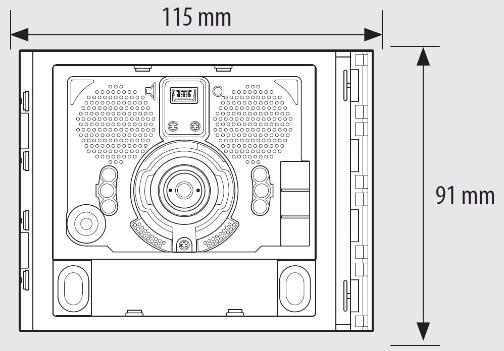 Modulo audio video per la realizzazione di impianti videocitofonici 2 fili. Dotato di telecamera a colori con sensore da 1/3"e LED bianchi per illuminazione del campo di ripresa. Resistenza di preriscaldo antiappannamento. Regolazioni volume altoparlante e microfono. Gestisce fino ad un massimo di 98 chiamate a pulsanti utilizzando moduli pulsanti su doppia fila aggiuntivi. Regolazione telecamera sugli assi orizzontale e verticale di +/- 10°. Consente l\'attivazione di una elettroserratura collegata direttamente ai morsetti S+ ed S- (18 V 4 A impulsivi - 250 mA mantenimento su 30 ohm max) ed il collegamento di un pulsante apriporta locale sui morsetti PL. Predisposto per alimentazione supplementare. Dotato di LED frontali per la segnalazione dello statodi funzionamento: apriporta, comunicazione attiva, chiamata inoltrata e sistema occupato. Sensore ottico integrato per l\'accensione della retroilluminazione notturna. Da completare con frontale di finitura. Il dispositivo deve essere configurato fisicamente oppure tramite PC e software TiSferaDesign.