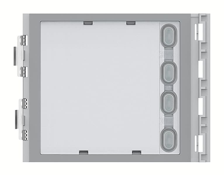 Modulo Sfera con 4 pulsanti aggiuntivi disposti su colonna singola. Da utilizzare in abbinamento ai moduli fonici 351000 - 351100 ed ai moduli audio video 351200 - 351300. Collegamento tramite apposito multicavo fornito a corredo. Retroilluminazione cartellini portanome comandata dal modulo fonico o dal modulo audio video abbinato. Da completare con frontale di finitura.