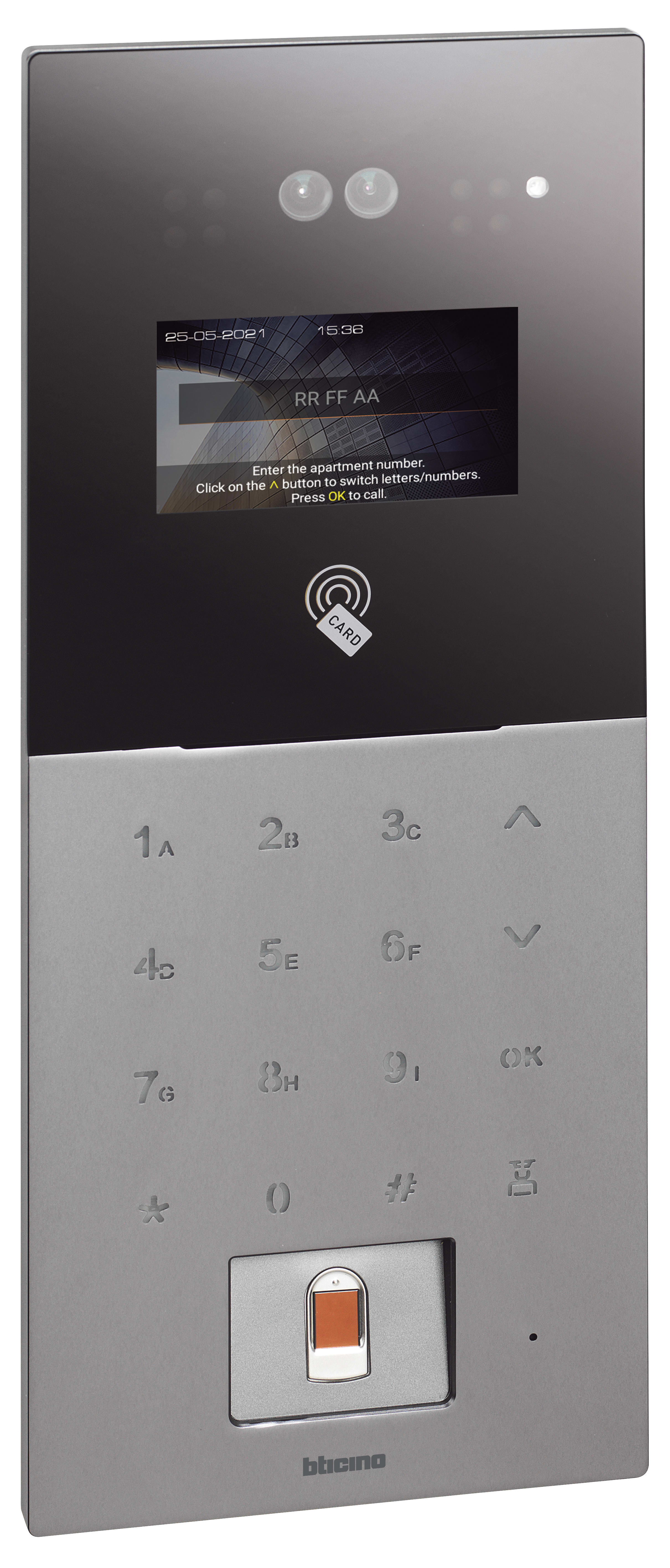 Pulsantiera esterna video con display 4,3”, tastiera con numeri e lettere (A-I), telecamera a doppio riconoscimento facciale, lettore impronta digitale e lettore badge per funzioni di controllo accessi. Tramite tastiera è possibile effettuare le chiamateagli appartamenti, al centralino di portineria e inserire il codice di accesso per attivare l’elettro serratura. Configurazione per diverse modalità di chiamata: Codice appartamento (Area - Condominio - Scala - Piano - Appartamento); Codici numerici o alfanumerici per i residenti. Accesso al menù tramite un codice specifico per la manutenzione e per la gestione delle impostazioni (es. luminosità della retroilluminazione, volume della suoneria, volume dell’altoparlante, volume tasti, durata dello screensaver). Possibilità di caricare screensaver personalizzati tramite il software di configurazione. La pulsantiera può essere alimentata tramite PoE (power over Ethernet) o direttamente tramite l’alimentatore 375005. Installazione da incasso con scatola dedicata 375006.