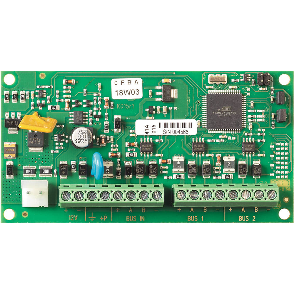 Stazione di alimentazione supervisionata che consente di rialimentare e replicare il BUS antifurto estendendolo su due rami aggiuntivi.L’alimentazione alle due nuove tratte è fornita tramite il dispositivo stesso, protetto da un fusibile termico autoripristinante da 1,5A e collegato agli alimentatori presenti nei contenitori art. 4210 e art. 4211.