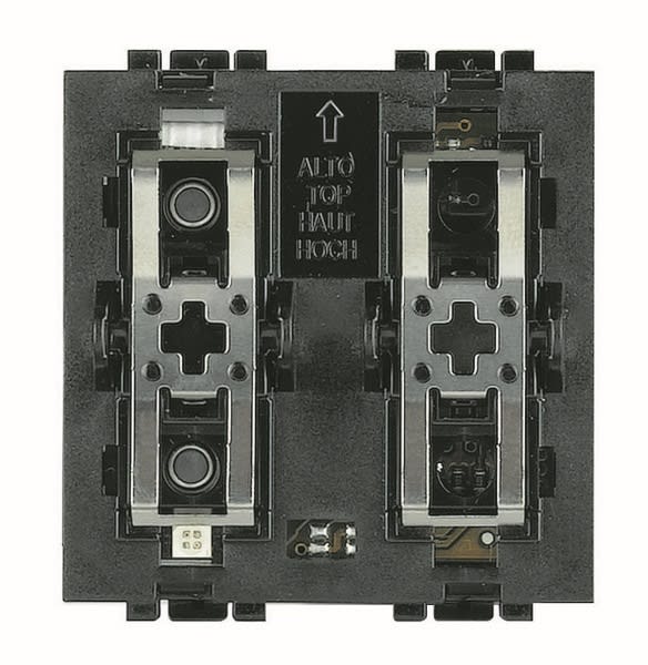 Attuatore ad incasso Matix con 2 relè interni 2A 250Vac e dotato di 4 pulsanti e 3 led bicolore realizzato per funzionare in abbinamento ai dispositivi di comando evoluti AM5860M2 specifici per la gestione delle tapparelle - 2 moduli.