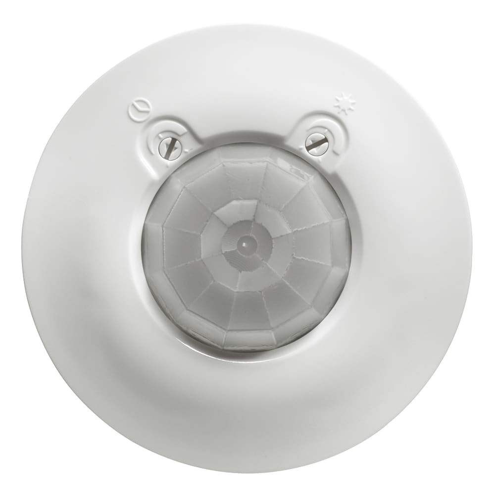 Switch Sensor ad infrarosso passivo per il rilevamento del movimento e del livello di illuminamento, tecnologia “Zero Crossing”, gestione ON/OFF del carico, installazione ad incasso nel soffitto tramite molle o scatola da incasso, grado di protezione IP41, connessione a morsetti a vite, area di copertura circolare di diametro 8 m per un’altezza di installazione di 2.5 m, altezza massima di installazione di 6 m, alimentazione 240 Va.c., 50/60 Hz, carico massimo di 4.3 A a 230 Va.c., regolazione tramite trimmer del livello di illuminamento da 10 lux a 1275 lux e del tempo di ritardo da 10 s a 10 min.