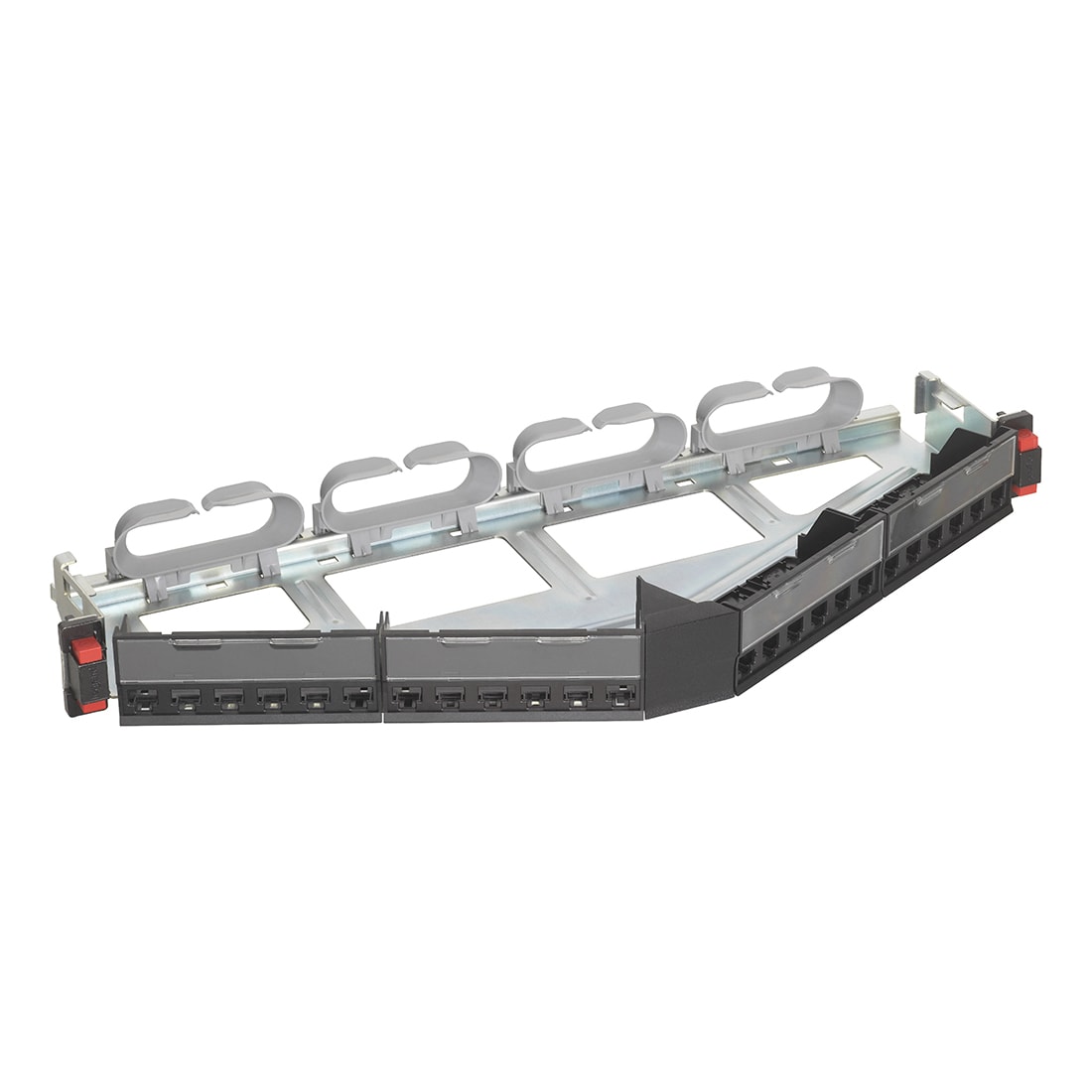Pannello di permutazione angolare da completare (vuoto) con connettori (art. C9080PC5EU ) RJ 45 CAT 5E UTP, modello Quick Connect.Il pannello angolare evita il passaggio orizzontale delle bretelledi permutazione , utilizzando il passacavo laterale art.C9024QHD. Ogni blocco può contenere 6 connettori RJ 45 (art. C9080PC5EU) con messa a terra automatica Guida cavo ergonomico incorporato per fissare i cavi in modo sicuro, Sistema Quick Fix laterale per il montaggio senza viti sui montanti da 19”. Provvisto di targhette colorate identificative.