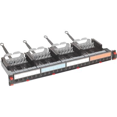 Pannello di permutazione completo di 24 connettori RJ 45 CAT 5E UTP, modello Quick Connect. Equipaggiato con 4 blocchi estraibili tramite pulsante, nel quale sono già alloggiati i connettori installabili senza attrezzi, Quick Connect. Ogni blocco contiene 6 connettori RJ 45 cat 5E UTP con messa a terra automatica. Guida cavo ergonomico incorporato per fissare i cavi in modo sicuro. Sistema Quick Fix laterale per il montaggio senza viti sui montanti da 19”. Provvisto di targhette colorate identificative.