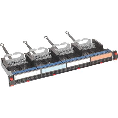 Pannello di permutazione completo di 24 connettori RJ 45 CAT 6 STP, modello Quick Connect, premontati. Equipaggiato con 4 blocchi estraibili tramite pulsante, nel quale sono già alloggiati i connettori installabili senza attrezzi, quick connect. Ogni blocco contiene 6 connettori RJ 45 CAT 6 STP con messa a terra automatica. Guida cavo ergonomico incorporato per fissare i cavi in modo sicuro, Sistema Quick Fix laterale per il montaggio senza viti sui montanti da 19”. Provvisto di targhette colorate identificative.