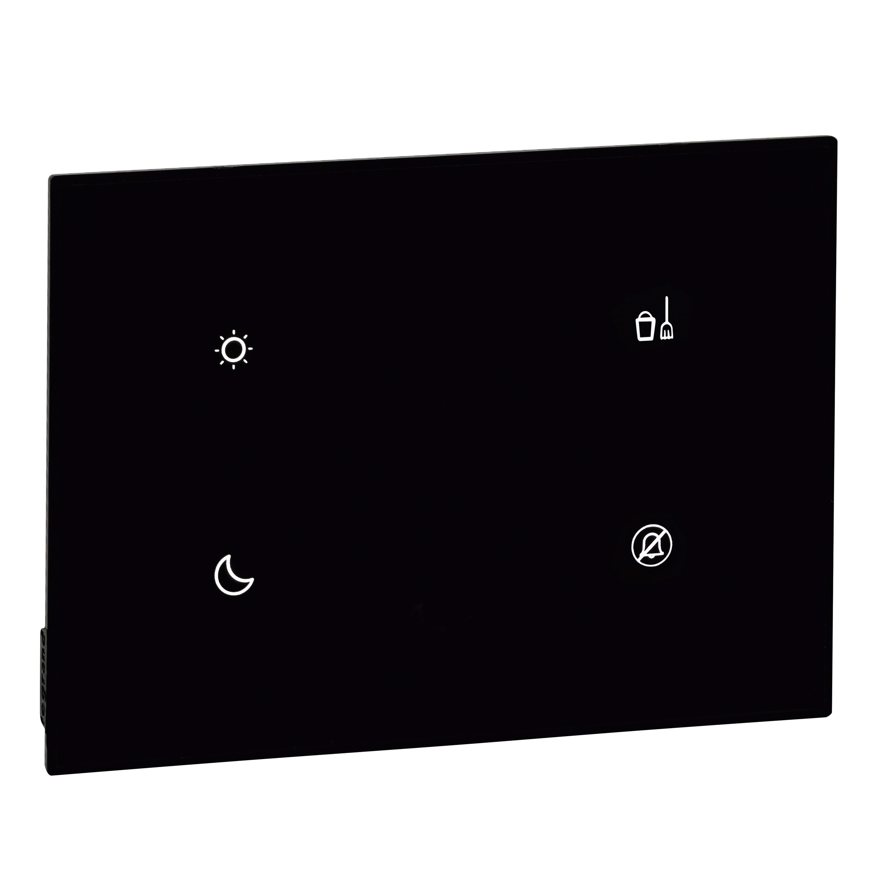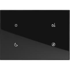 Comando a 2 scenari + comandi DND e MUR dispositivo a 4 comandi con finitura placca coloreNERO in materiale plastico.Esso è dotato di 2 comandi scenari da programmare nel MH201 e 2 comandi fissi: non disturbare DND erifacimento camera MUR.Collegamento a SCS-BUS, dimensioni 2 moduli.