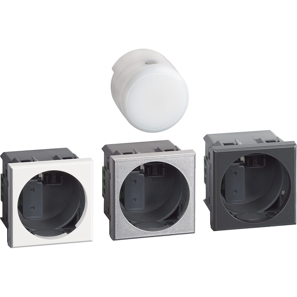 torcia estraibile e ricaricabile con dispositivo automatico di accensione. Si accende automaticamente in caso di interruzione della corrente - sistema di estrazione push&pull (premi ed estrai) completa di base di ricarica - LED a luce bianca ad alta efficienza luminosa - interruttore ON/OFF e pulsante SPOT per aumentare la luminosità quando necessario - batterie intercambiabili al Ni-MH senza effetto "memoria" - autonomia di 2 ore - basso consumo in stand-by 0,4W - alimentazione 230 Va.c. - 2 moduli - fornita in confezione con base e mostrina di finitura opalina, neutre.
