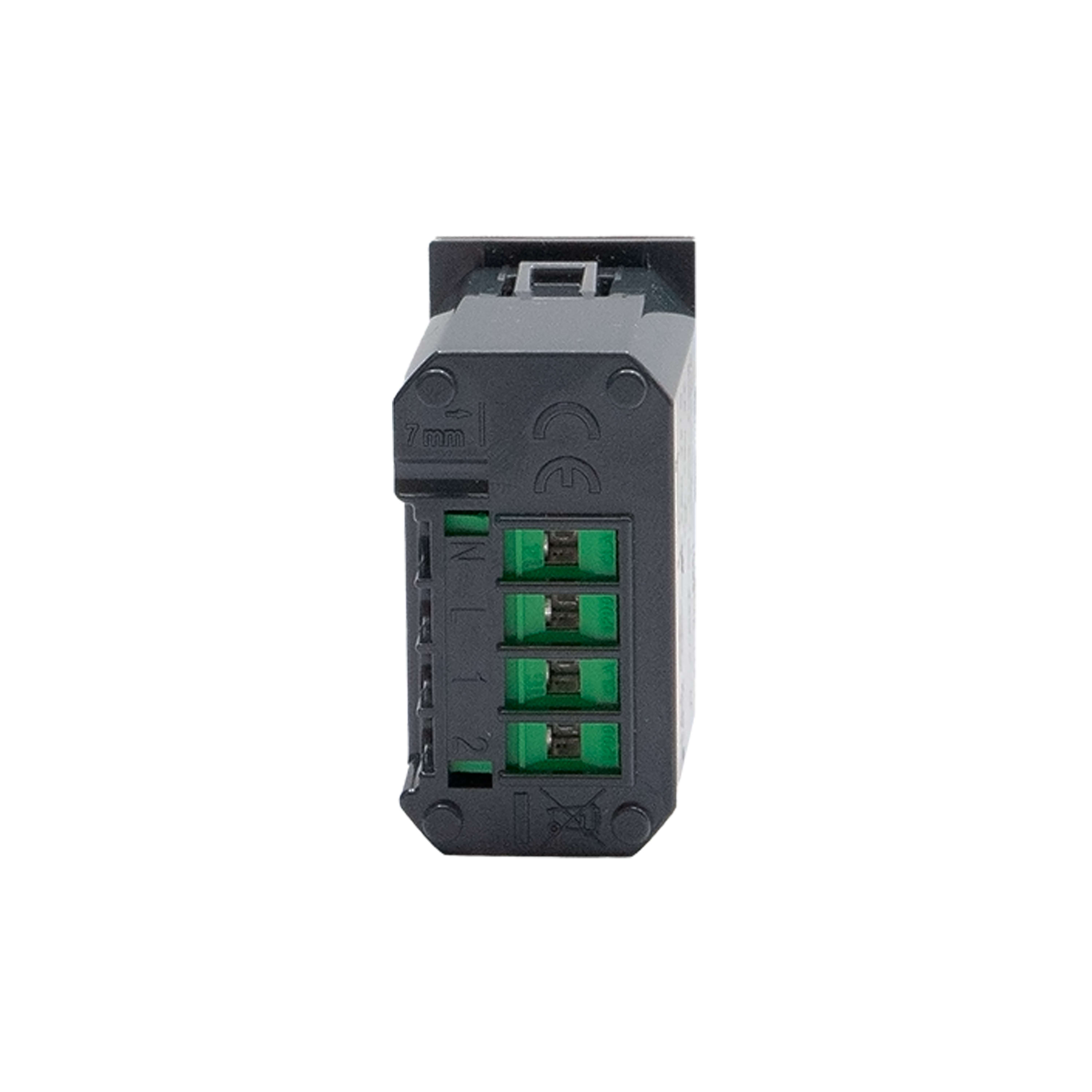 Deviatore connesso. Permette di controllare le luci localmente o da remoto. Si installa come un deviatore tradizionale ed e compatibile con tutti i carichi con potenza massima di 250 W. E dotato di un LED blu, configurabile dall’APP HOME + CONTROL, per le funzionalità di localizzazione e stato carico. Può essere associato ad uno o più comandi wireless. Attenzione: è necessaria la connessione al neutro. Alimentazione 110-230 Va.c. - 1 modulo - grigio