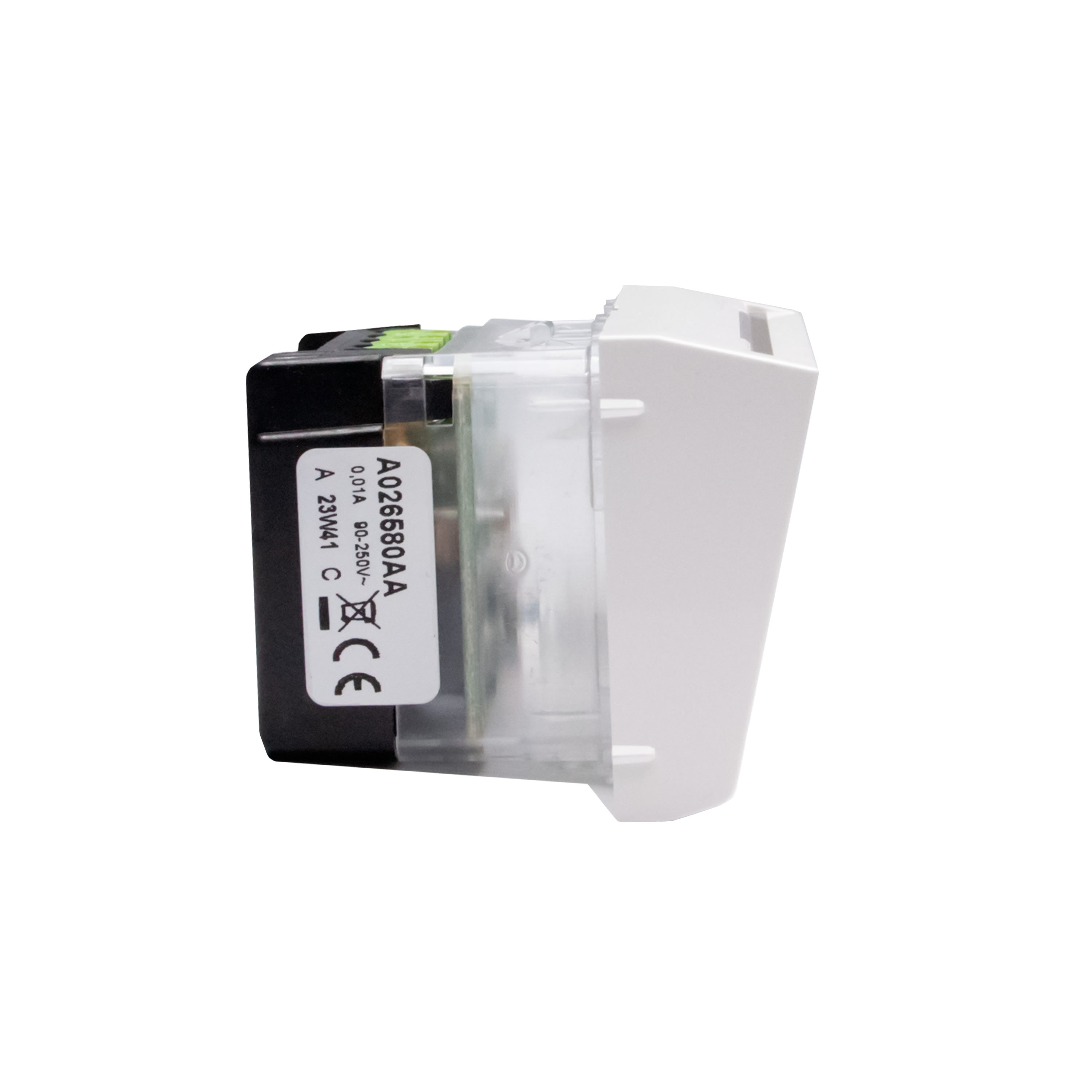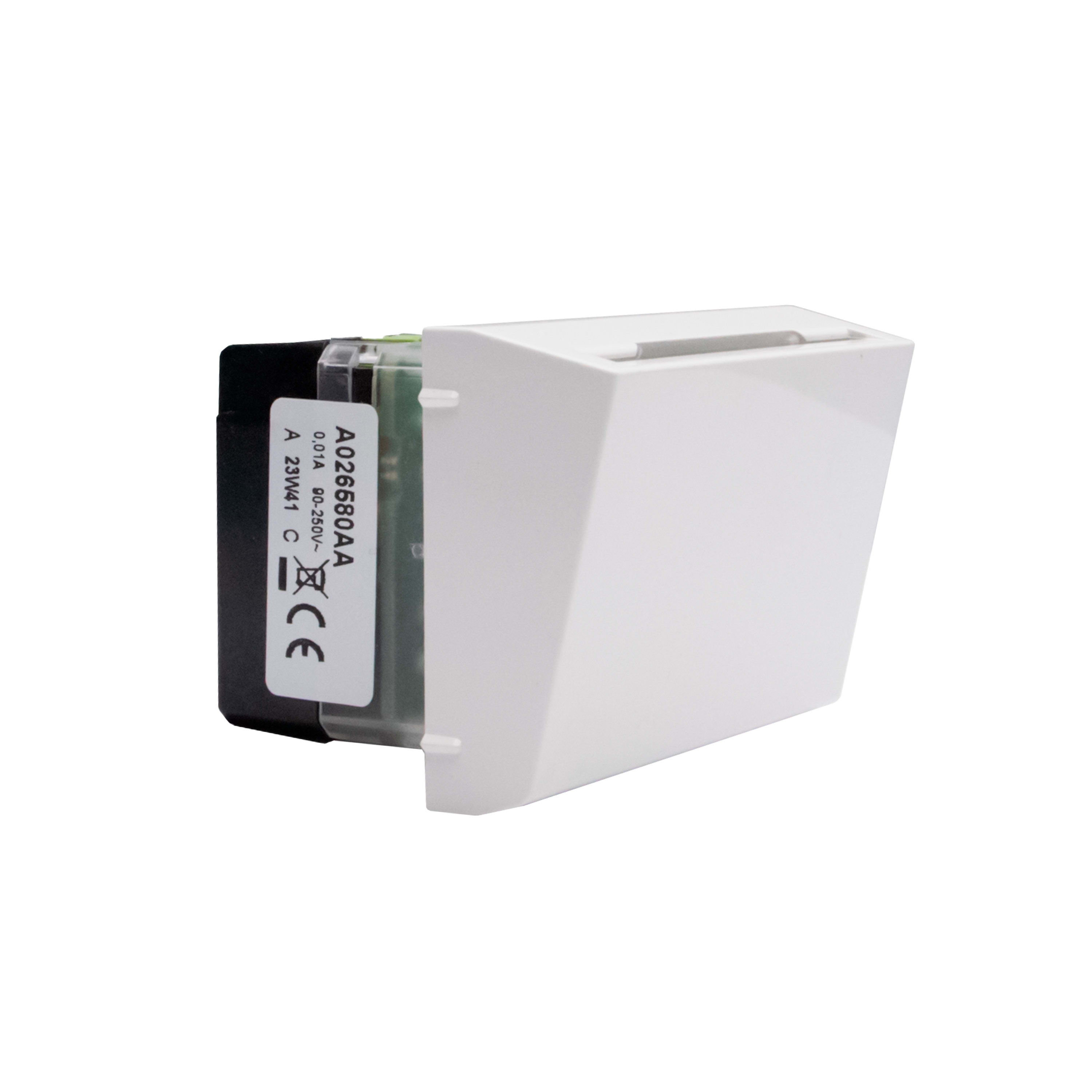 Tasca portabadge per l’alimentazione della camera d’albergo, con riconoscimento tecnologia RFID, fessura illuminata da lampada incorporata - spegnimento ritardato di circa 30 secondi - alimentazione 230 Va.c. - 2 moduli - fornito con mostrina - bianco