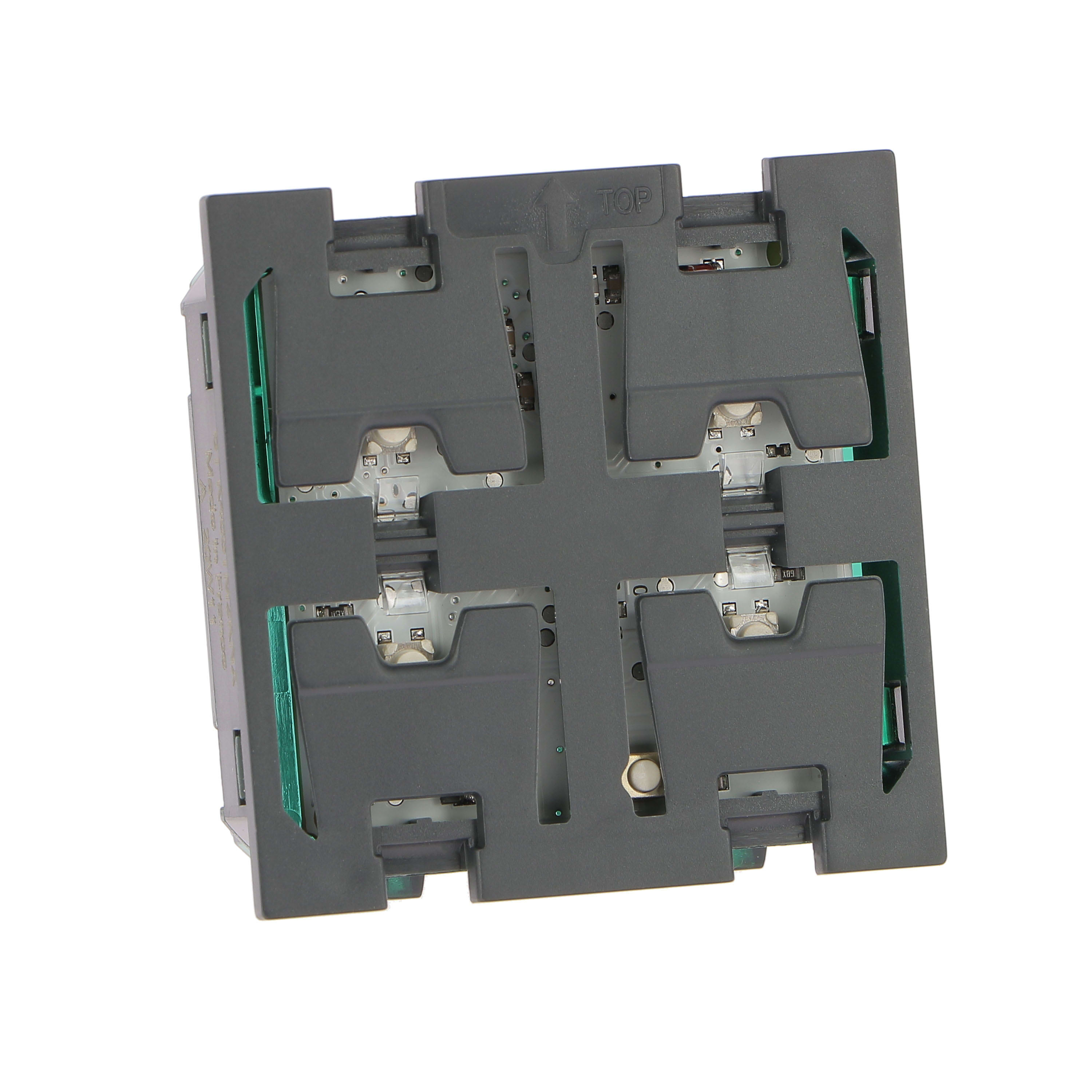 Dispositivo di comando a 4 canali per la gestione dell’illuminazione (di tipo ON/OFF, dimmer), gestione scenario, forzatura del carico, gestione delle tapparelle (su, giù, stop), tende da sole e dispositivi vari. Dotati di LED RGB programmabili (12 colori disponibili) per visualizzare lo stato del carico e il feedback sullo stato del sistema (normale, forzato, disattivazione, spia di segnalazione giorno/notte, ecc.) e allarmi. Da completare con copritasti della serie Living Now.