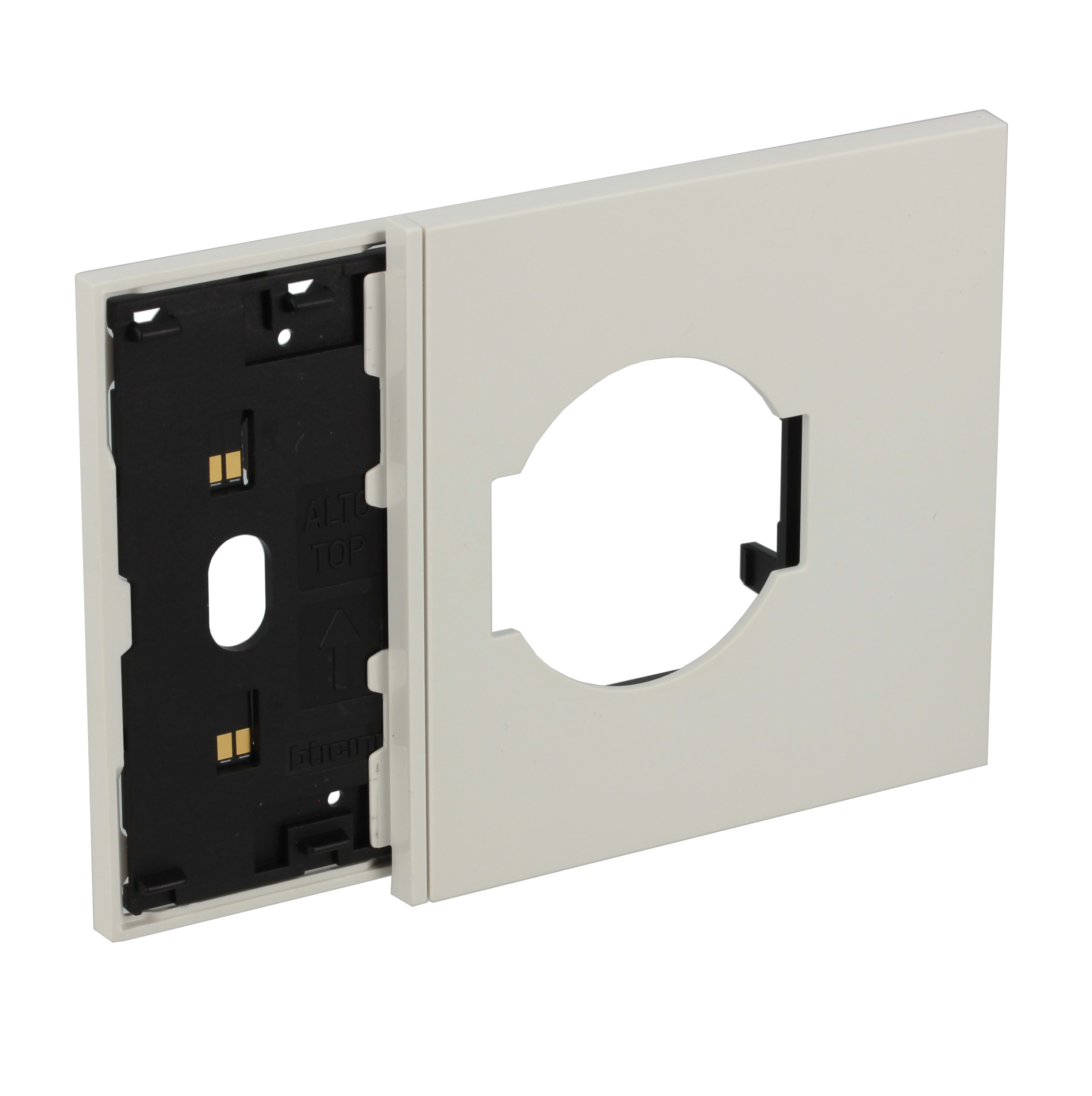 Frame elettrificato con mostrina presa standard italiano e tedesco, per l’installazione di 1 comando digitale e di una presa 2P+T (articoli compatibili: KW4140A16, KW4140A16F). Installazione in scatola da 3 moduli con supporto K4703. Colore bianco.